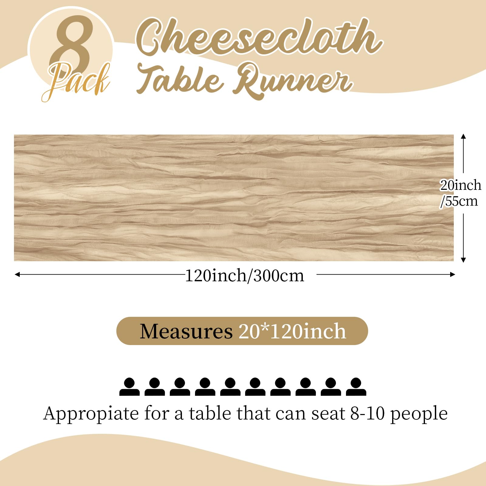 8 Pack Beige Cheesecloth Table Runners 20x120 Inch Gauze Table Runner Cheese Cloth 10FT Beige Table Runner Rustic Sheer Runner for Wedding Birthday Party Baby Shower Table Decor