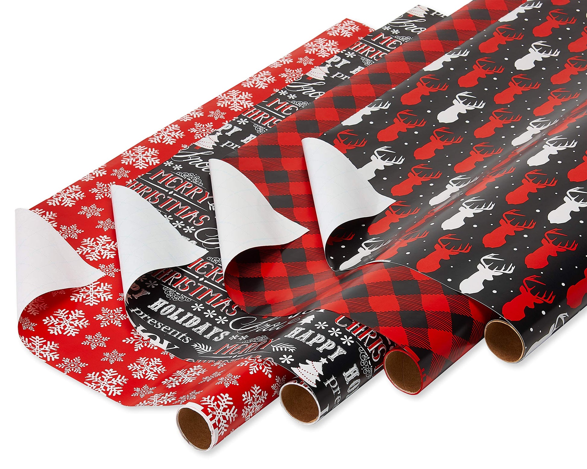 American Greetings 120 sq. ft. Red and Black Christmas Wrapping Paper Set with Cut Lines (4 rolls 30 in. x 12 ft., 7 Bows, 30 Gift Tags), Christmas Text, Plaid, Reindeer and Snowflakes
