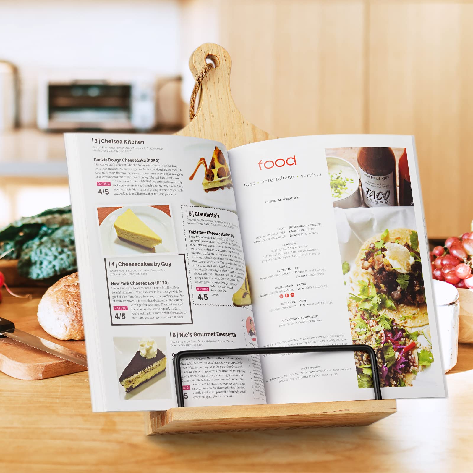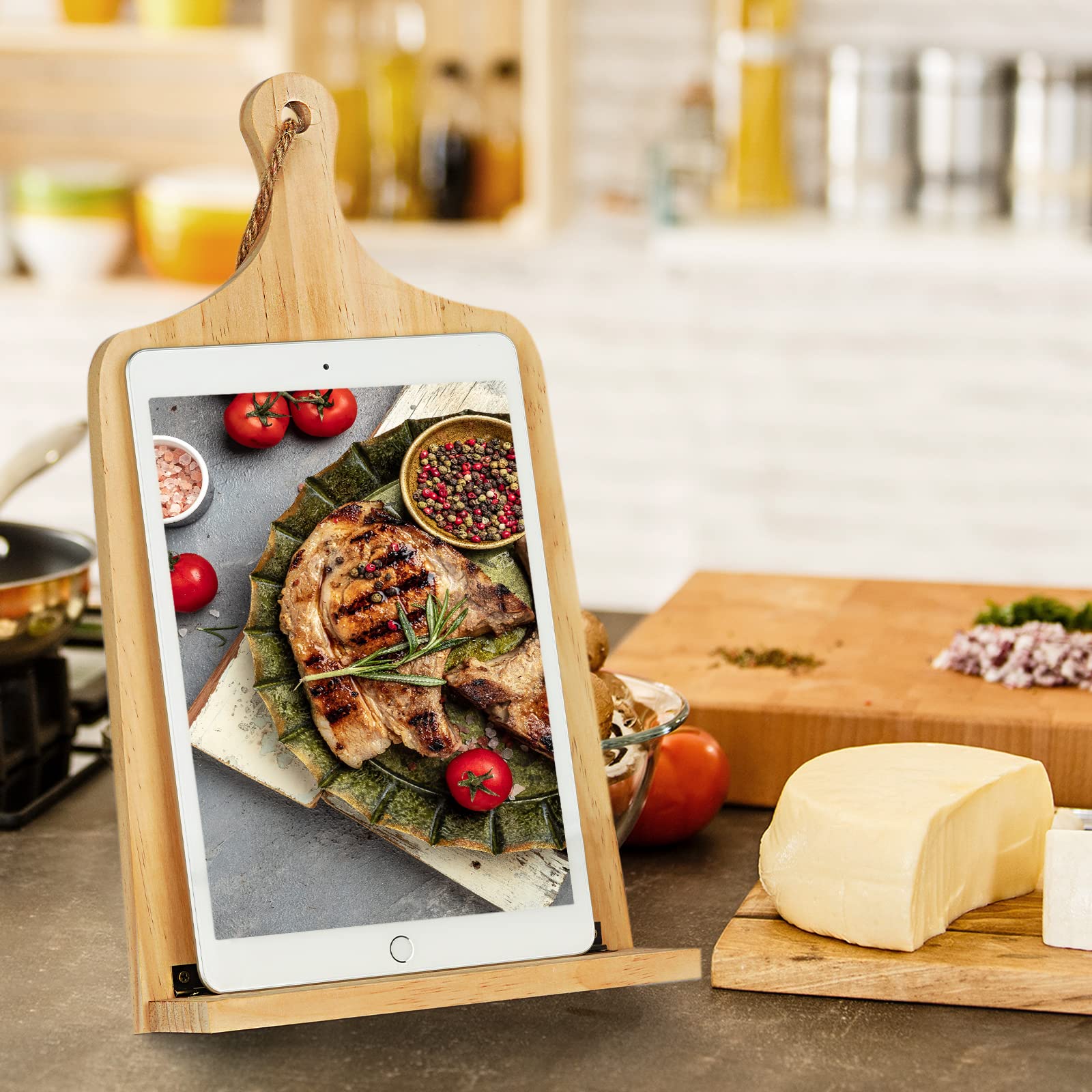 - Multi-Purpose Design: This wood cook book stand is doubles as home decor when not in use, thanks to a hangable handle. The recipe holder stand non-slip base ensures stability. Remove metal rods for propping up tablets or phones