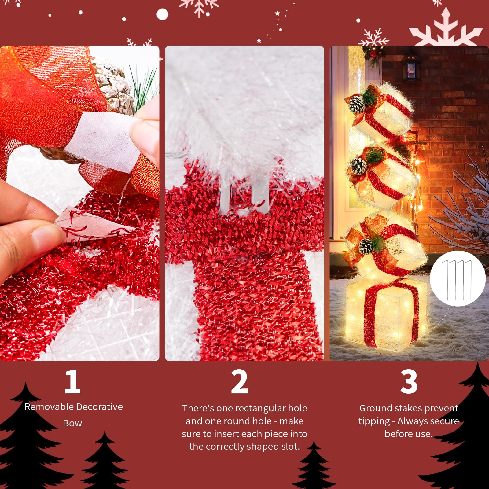 - Easy to Assemble: The lighted gift boxes can be stacked up to 3.6Ft tall. Each box has a hidden round hole and rectangular slot—just match the shapes to stack them securely. (Note: The slots are discreetly designed, so check carefully!)