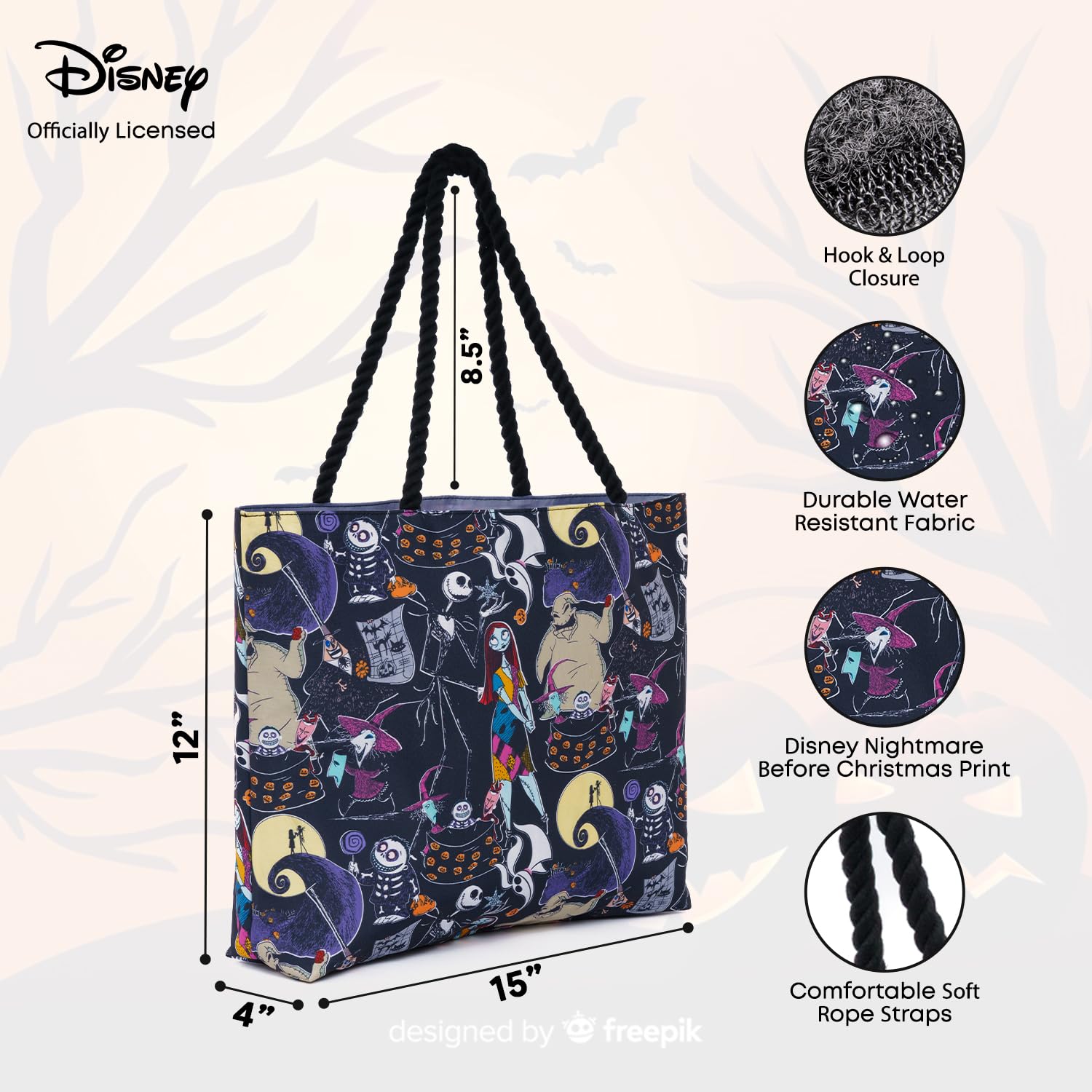 - 𝗢𝗳𝗳𝗶𝗰𝗶𝗮𝗹𝗹𝘆 𝗟𝗶𝗰𝗲𝗻𝘀𝗲𝗱 𝗗𝗶𝘀𝗻𝗲𝘆: Immerse yourself in Tim Burton's spooky world with this Nightmare Before Christmas tote featuring Jack Skellington, Sally, and Zero. Perfect for fans of the cult classic film, this bag lets you carry Halloween Town's charm year-round. Ideal for Halloween celebrations, Disney park visits, or adding a touch of playful gothicism to your daily outfits. Show off your love for this beloved movie wherever you go.