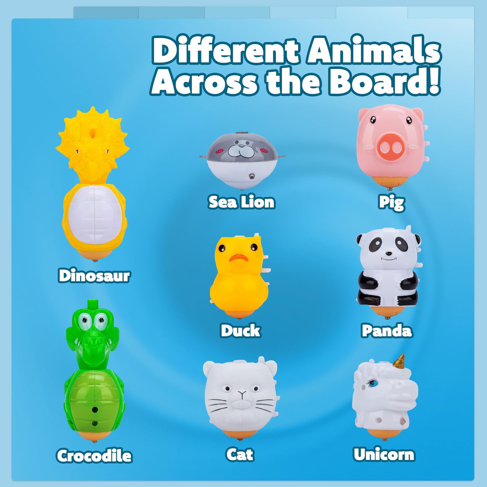 - SPINNING SAFARI FUN: This set of animal light up spinning tops for kids features 8 adorable characters like a unicorn, panda, and dino—all ready to light up and spin into action!