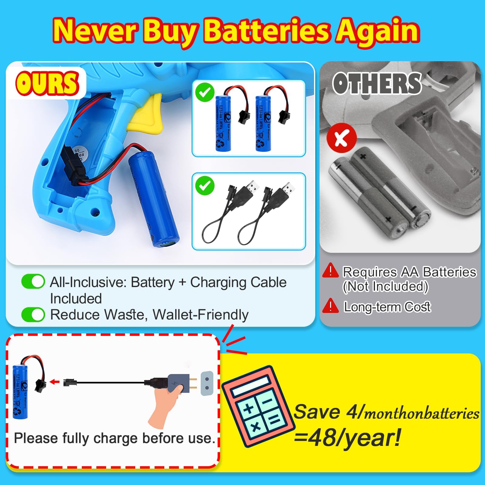 - EASY TO USE: Our bubble guns for toddlers 1-3 includes everything you need. No need to buy and replace batteries frequently. The rechargeable battery and cable ensure uninterrupted bubble fun. Just charge the battery before use, connect it with the cable, with a simple press of the trigger, you can unleash a stream of delightful bubbles. Kids favorite Outdoor toys!