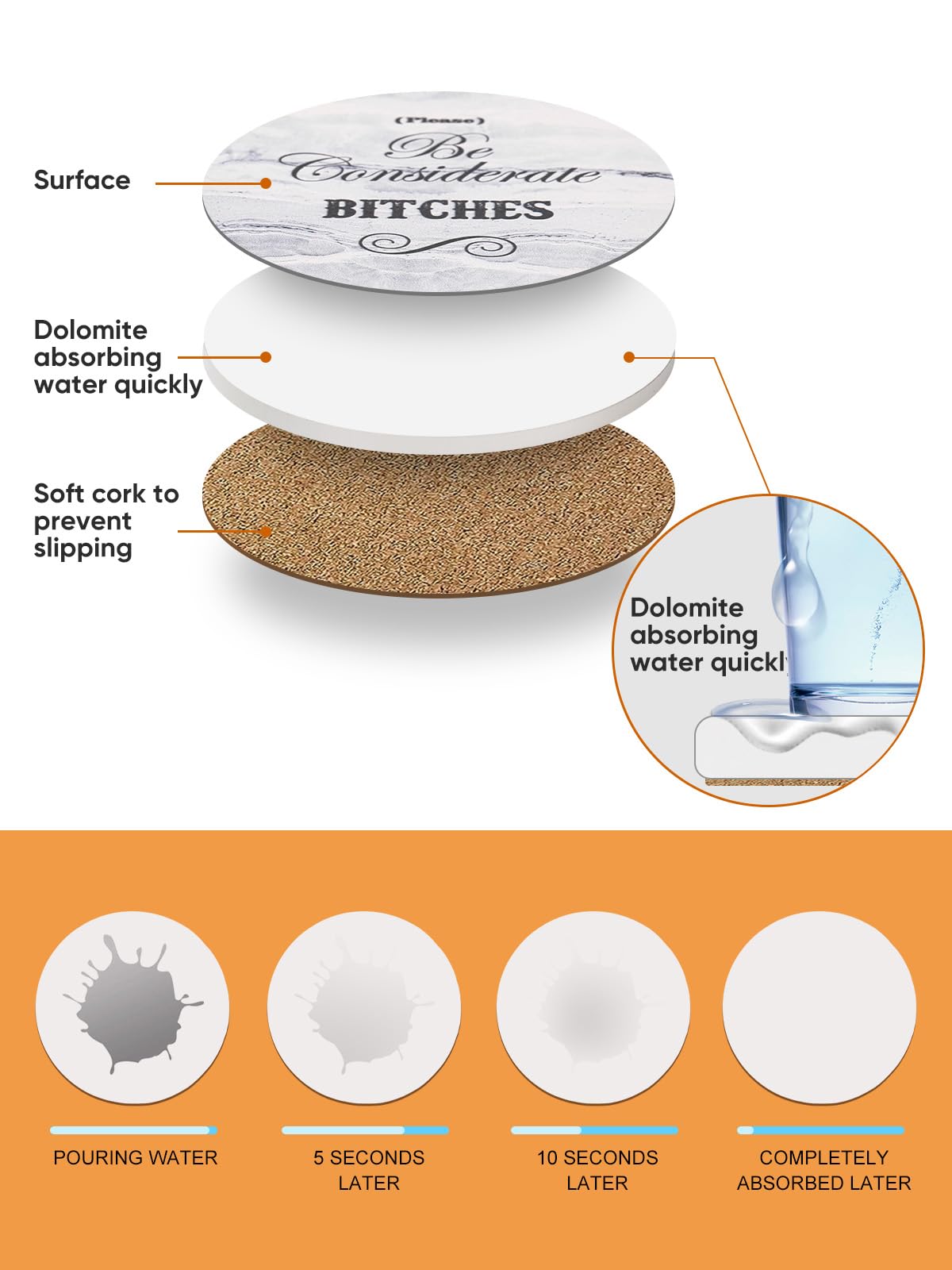 - Wow, Amazing Absorbent Coasters : These cute funny coasters made from high-quality absorbent ceramic stone that will quickly absorb drops of water to keep the table clean. More absorbent than sandstone coasters