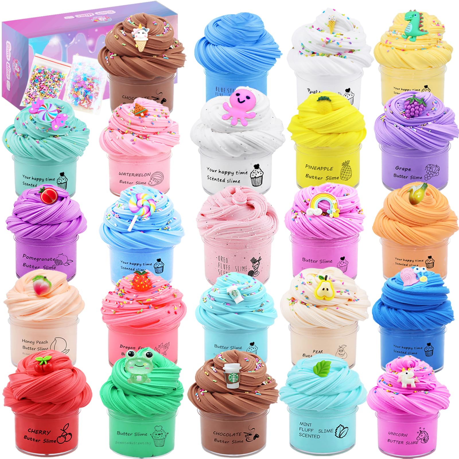 - Package includes - 24 pack multi colored butter slimes and charms.