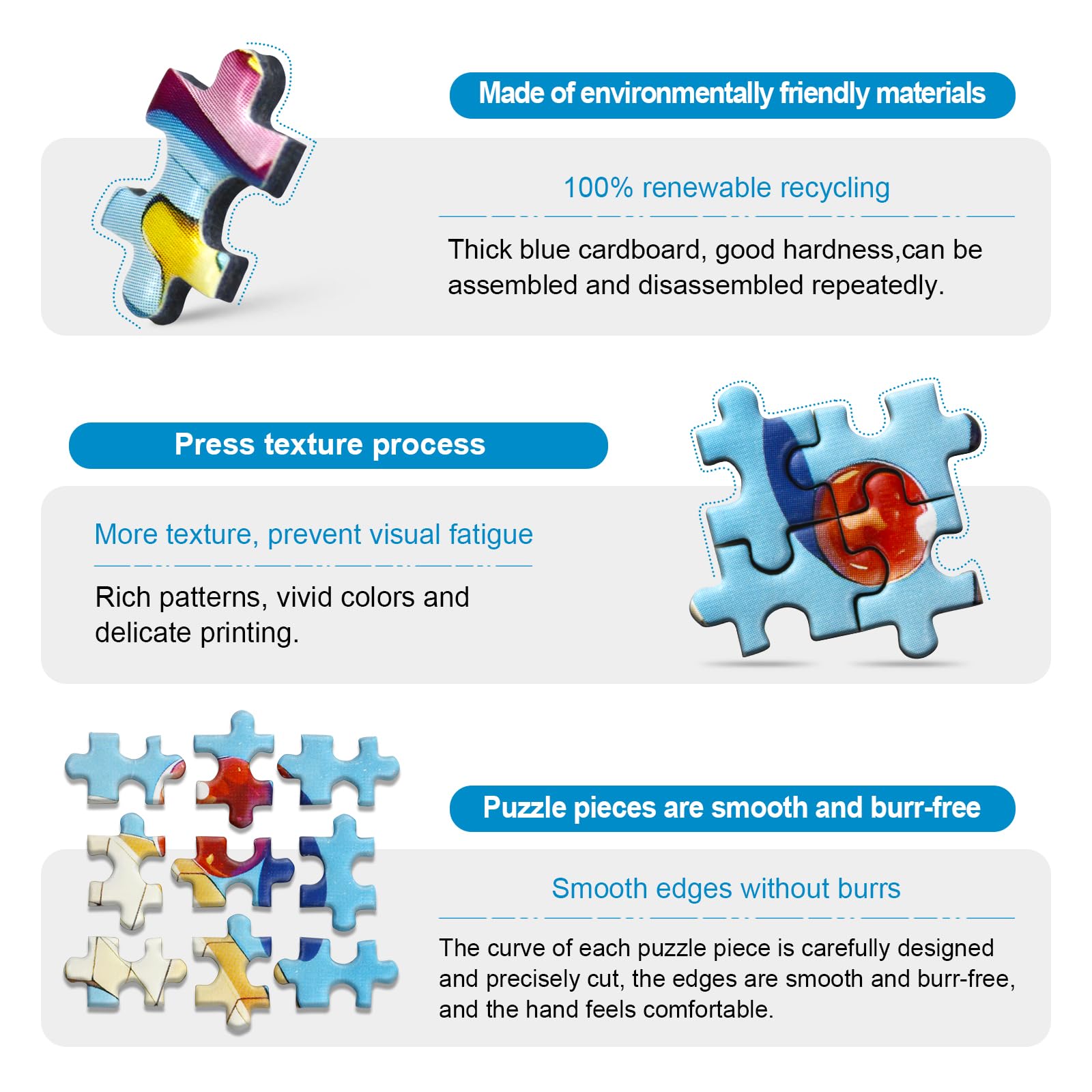 - High Quality Puzzles: small jigsaw puzzles are printed on high quality recyclable blue card stock and non-toxic ink, each piece is made with surface embossed, glare free technology. Compared to other puzzles, LinPuzzle puzzle is the smallest puzzle in the world and very challenging.