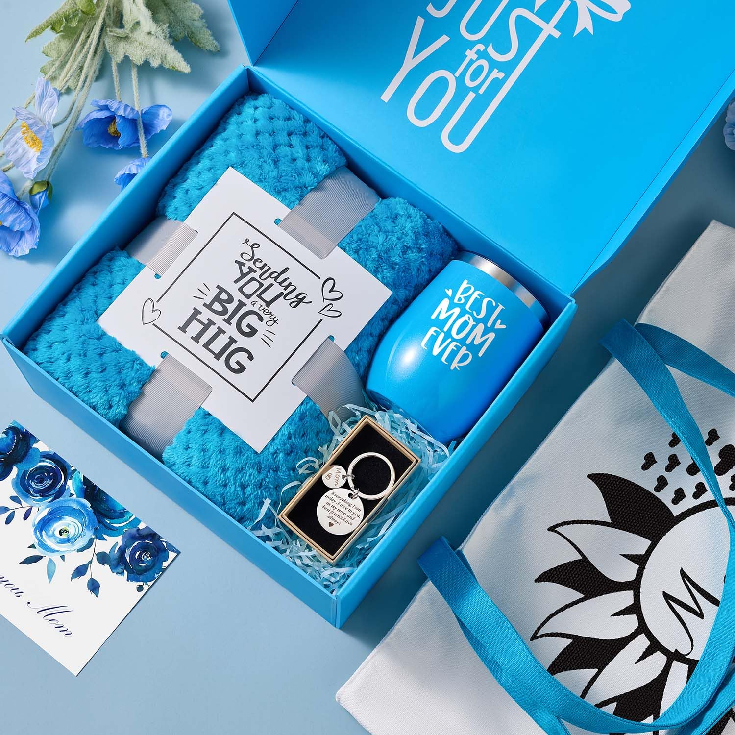 - Thoughtful Christmas Gifts for Mom: Inside the beautiful blue mom gift box, you'll find a stylish canvas bag printed with 'Mom,' a 12oz insulated tumbler featuring 'Best Mom Ever,' a stainless steel keychain engraved with 'Love Mom,' and a luxurious flannel blanket with 'this blanket is a hug from me to you. Each item adds a personal touch, making it perfect for mom birthday gifts, Christmas gifts for mom or gifts for wife from husbands to show love and gratitude