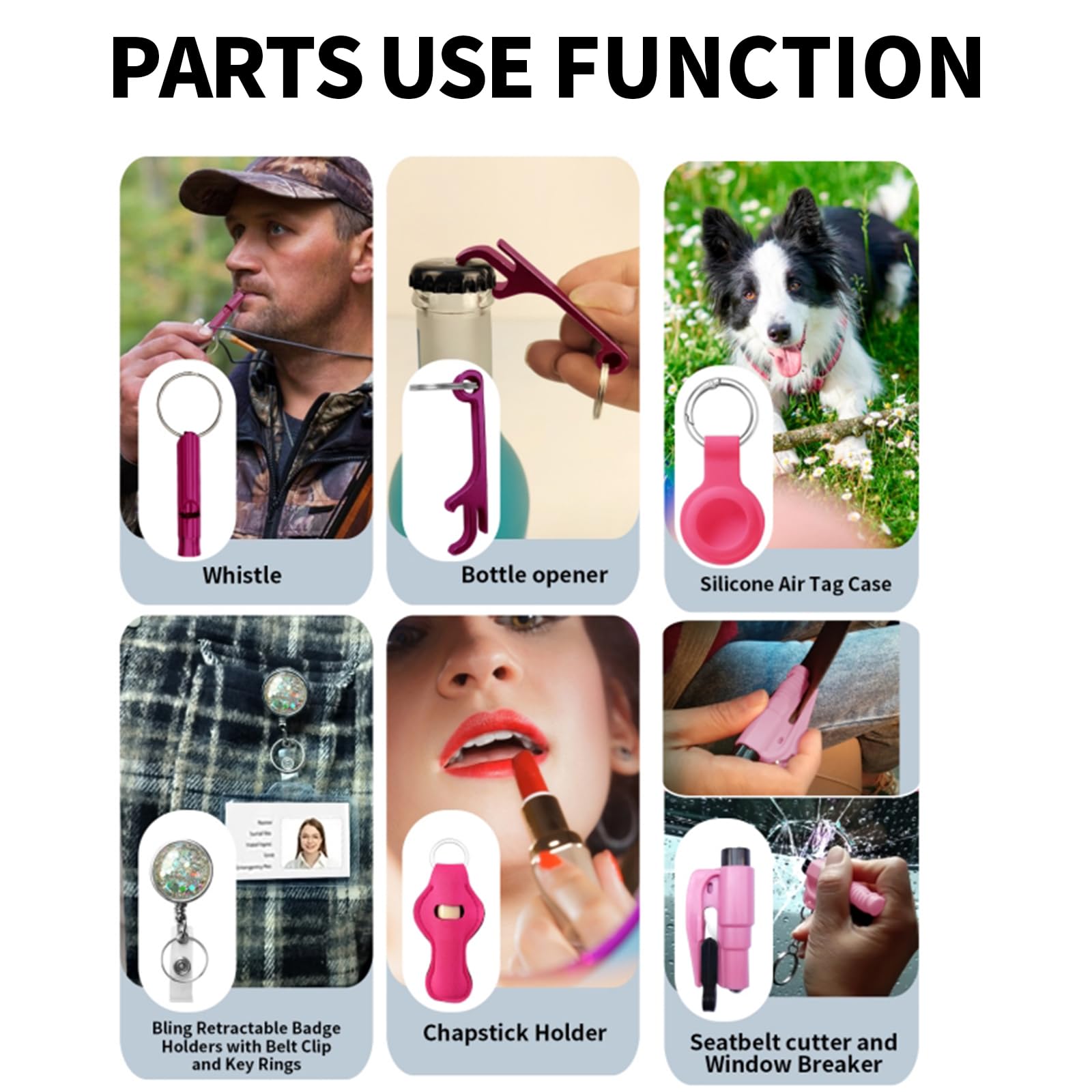 - Keychain Set Including: Lanyard, Wristlet Strap, Pom Pom, Personal Alarm, Whistle, Chapstick Holder, Bottle Opener, Air tag Holder and Other Women Keychain Accessories
