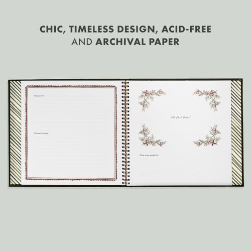 Chic, timeless design Elegant linen cover Acid-free and archival paper Generous 9.75' x 9.75' trim size offers ample space for photos and cards Lay-flat design allows you to easily write in the book A pocket to safely store letters to Santa and other Christmas keepsakes Lovingly designed artwork and thoughtful prompts encourage you to reflect and celebrate