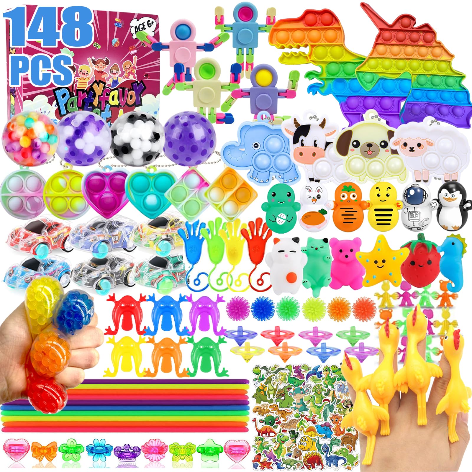 - 【Extensive Party Favors】These toy sets offer a variety of toy types, including squishy squeeze toys, sticky hands, flying chicken slingshot, spinners fingertips and and pull back cars various sensory toys and stress relieving toys which work to meet the needs of different children