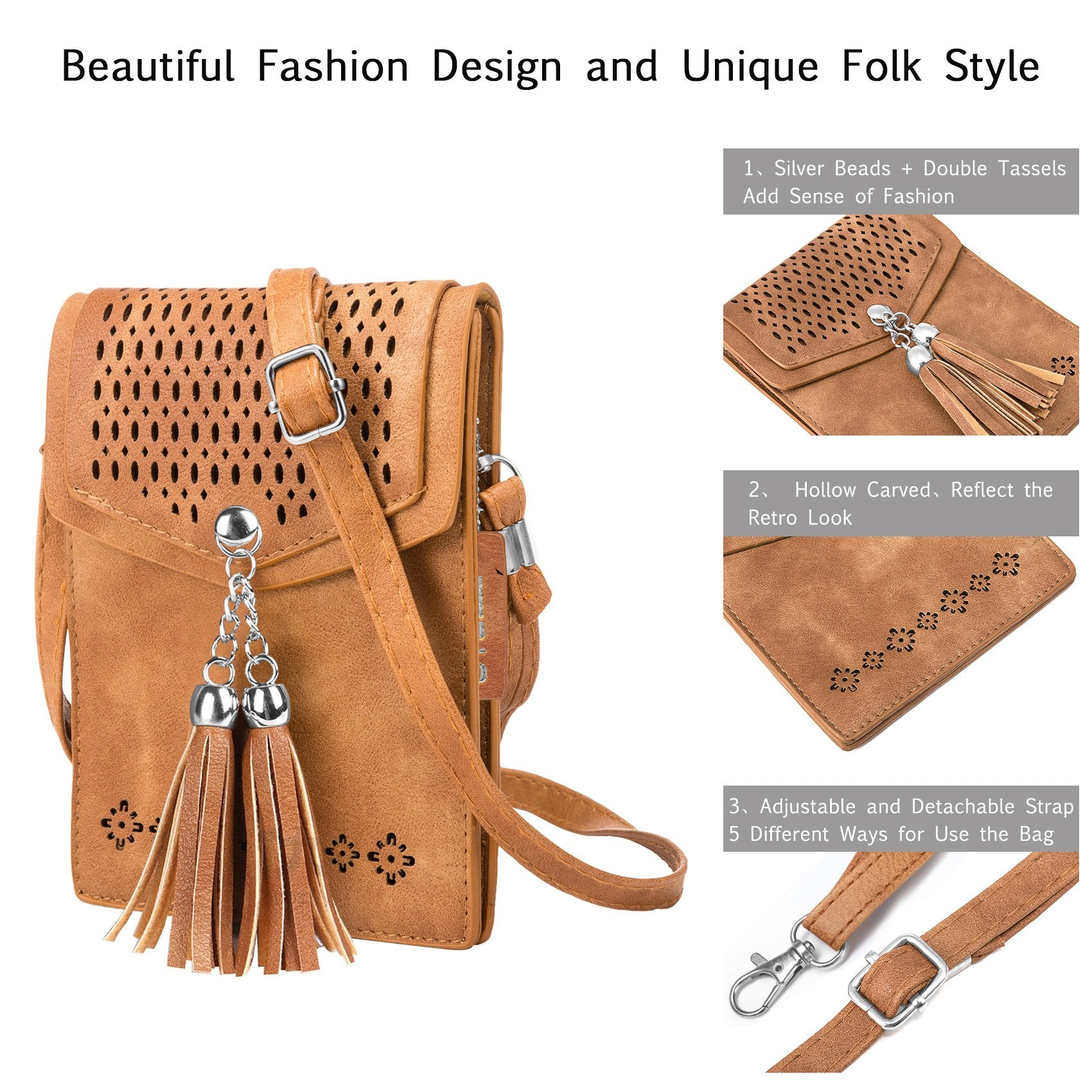 - 【Small crossbody purses】Mobile phone bag fringe cross body purse with Credit Card Slots have 3 pockets design and spacious room with snap on closure. The lightweight medium crossbody bag with tassel can hold PASSPORT, credit cards, cash, Lipstick. When you are going to the store, Cycling or walking dog, you will like the small cell phone purse crossbody.