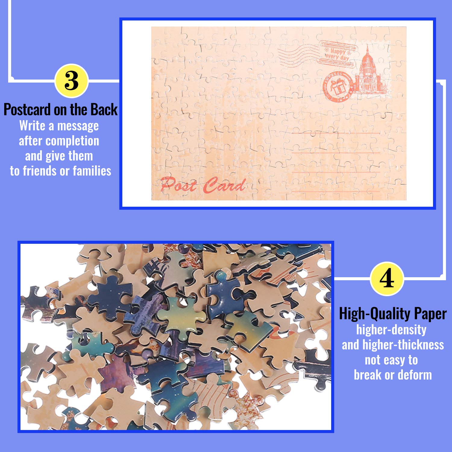 - 🧩【PERFECT AS A GIFT OR DECORATION】: Postcard design on the back.You can write a message after completion.Puzzles are a fun activity to do alone or in a group and it can also be used as a toy or as a gift(Birthday, Graduation, Easter, Thanksgiving, Valentine's day, Halloween, Christmas, New Year day and other events etc.),1x mini Easel included,You can easily turn one of them into a home decoration.
