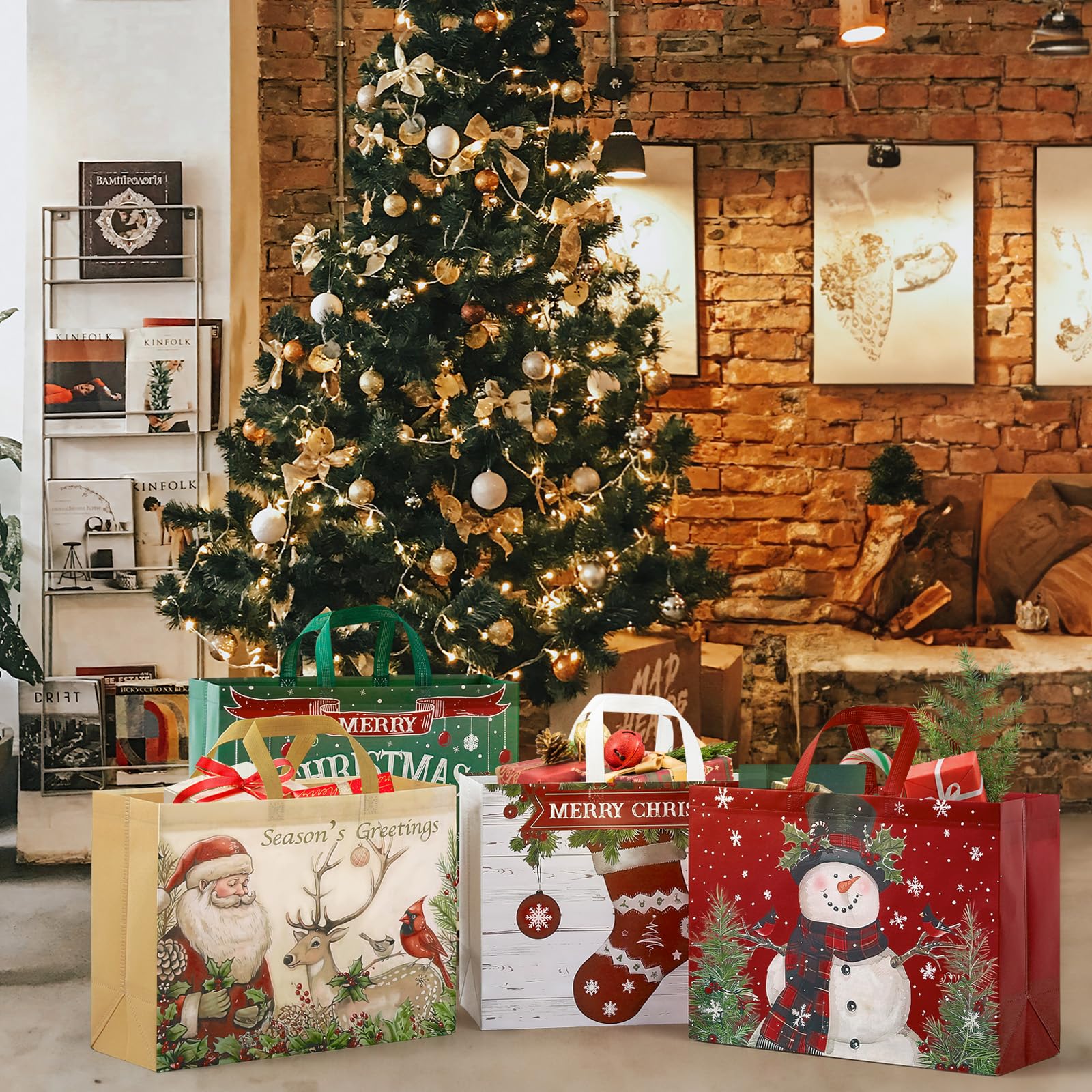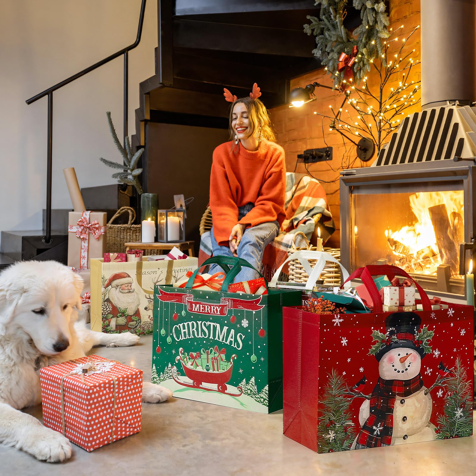 - 𝐂𝐡𝐫𝐢𝐬𝐭𝐦𝐚𝐬 𝐆𝐢𝐟𝐭-𝐖𝐫𝐚𝐩𝐩𝐢𝐧𝐠 𝐒𝐞𝐭: This collection includes 12 extra-large vintage-style Christmas gift bags (16.9' x 12.6' x 6.7'). Each bag is amply sized to hold substantial presents and comes in a selection of four traditional Christmas hues, adding a classic touch to your festive wrapping.