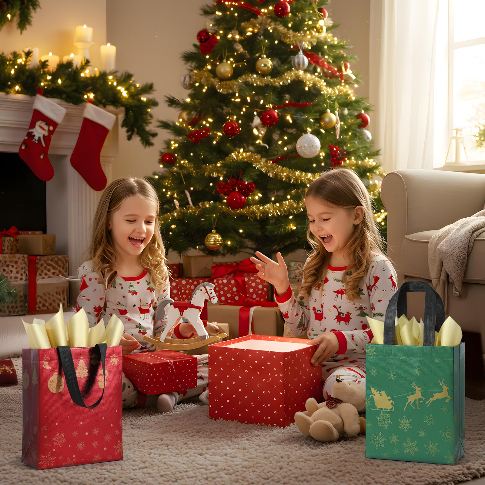 STYPOP 16 Pack 10" Christmas Gift Bags Medium Size with Tissue Paper, Reusable Non-Woven Christmas Tote Bags with Handles, Perfect for Holiday Gift Wrap/Party Favor Supplies, 10.2" × 8.3" × 4"