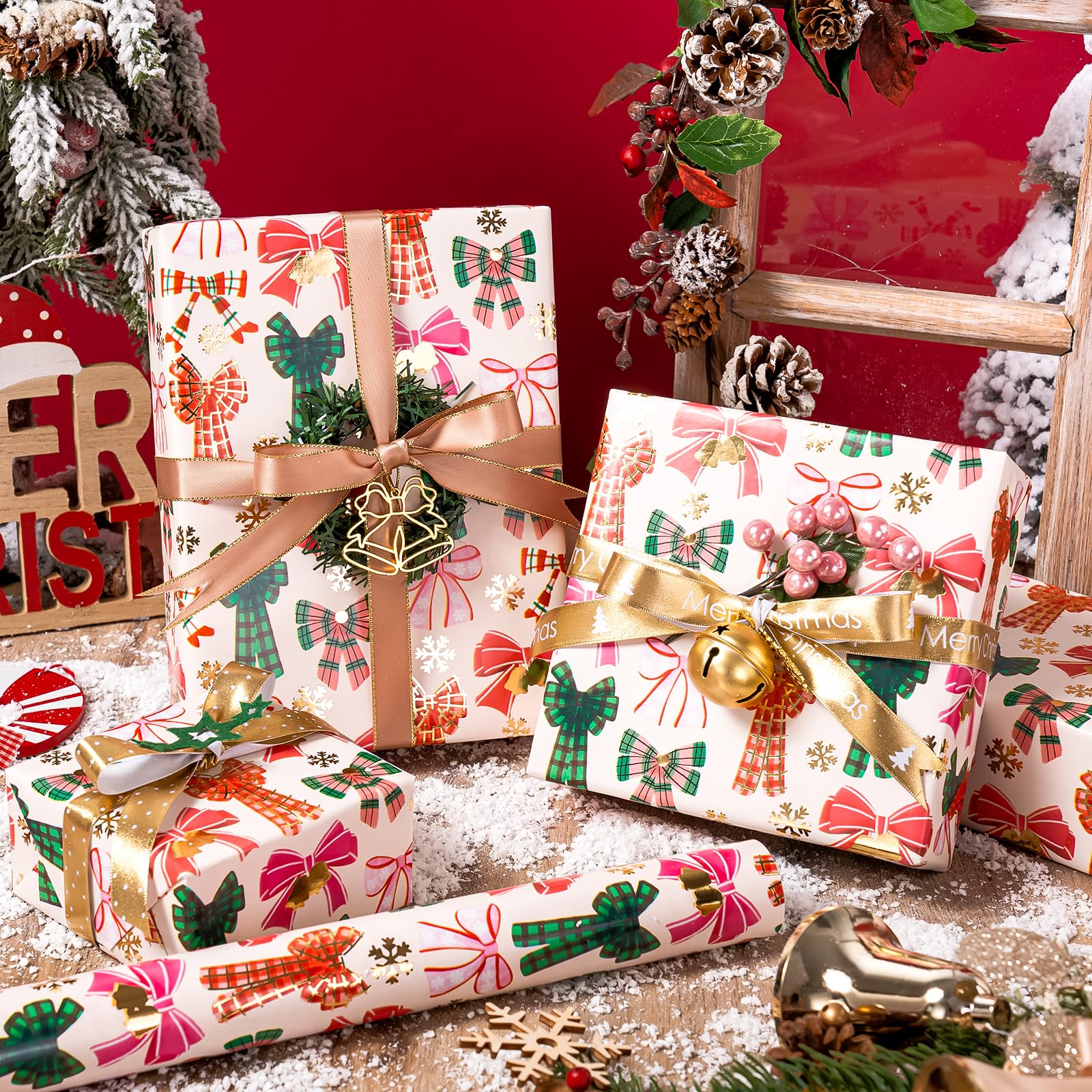 Christmas Design: Colorful plaid bows, snowflakes and Christmas elements with gold foil design, create a warm and festive atmosphere. It will make your gift - wrapping more textured, stylish, yet special.