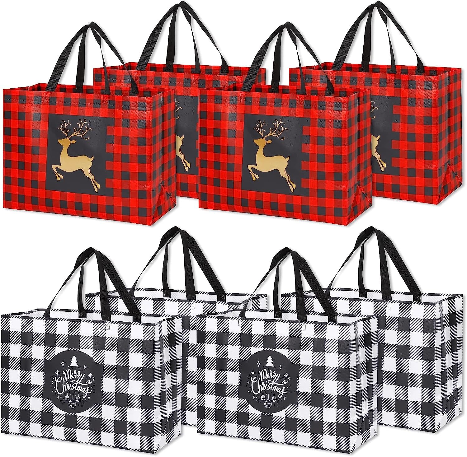 - PACKAGE INCLUDES -8 Pack bulk christmas tote bags 16.9*12.6*6.8', 2 different classic holiday designs. better product size ,sufficient to meet your holiday packing needs